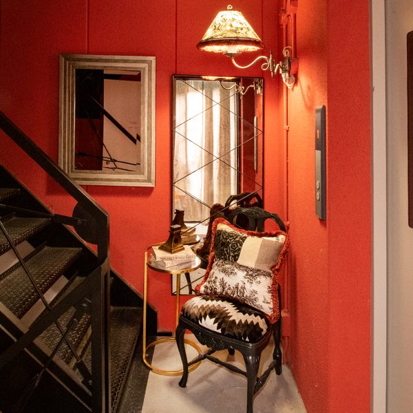そしてこちらは大きなミラーを窓に見立てたコーナー。レッド×ブラック×ゴールドのクールなコーディネートに。