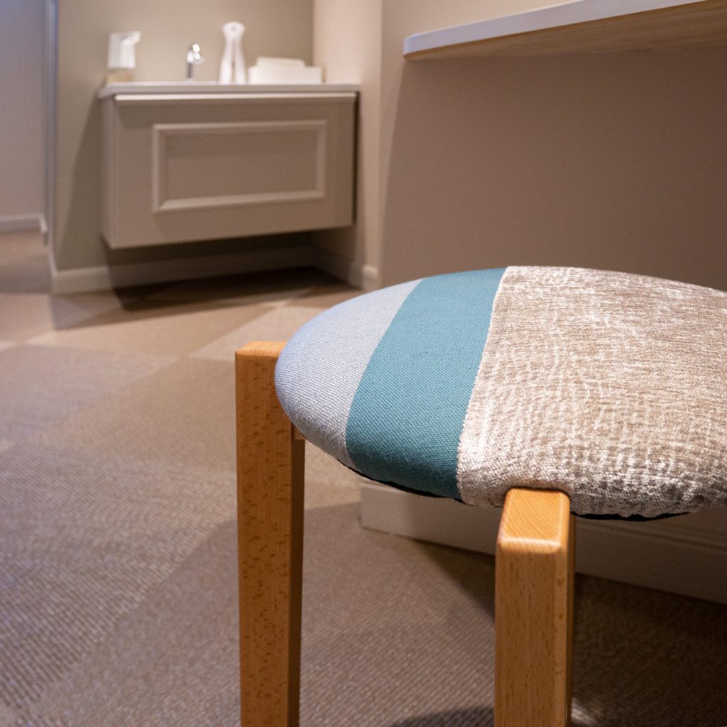 普段忙しくされているお客様に心から寛いでもらいたいという未来さんの想いが沢山詰まっており、お伝えしたい事は山ほどありますが(笑)今回はスツールのお話。ジョリボーテ様の待合室でベンチシートクッションを制作した時に少し余った生地があったので、一部はクッションの裏地として使い、ほんの少しをスツールに使いました。そうする事でインテリア全体が統一されます。