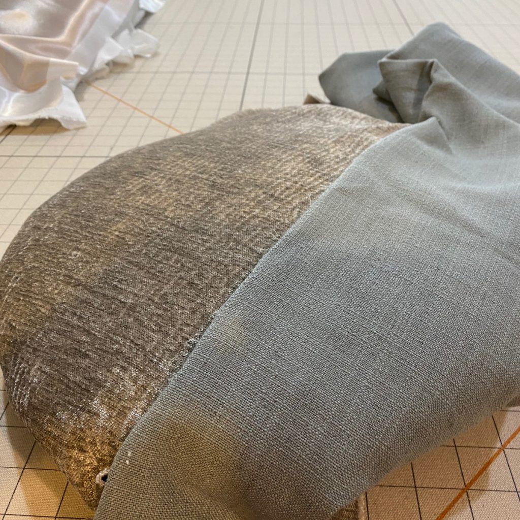 下の写真は生地を合わせてバランスを確認した時のものです。この段階に来るまで候補生地を色々と集めて「あーでもない、こーでもない」と検討していきます。社内で縫製や貼りもしているので、縫製担当者と生地の相性を確認したりと一つのスツールが仕上がるまでに色んなプロセスを踏んでいきます。