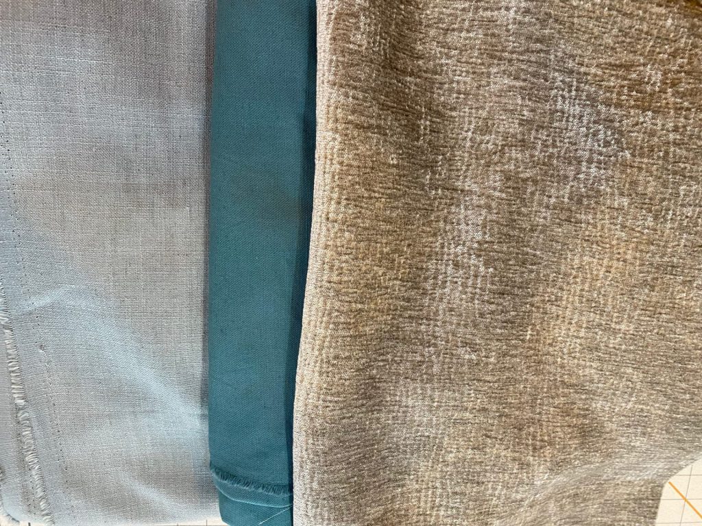 下の写真が待合スペースのベンチソファとクッションの生地です。グレーに統一された空間に最後は生地でアクセントを付けていきました。