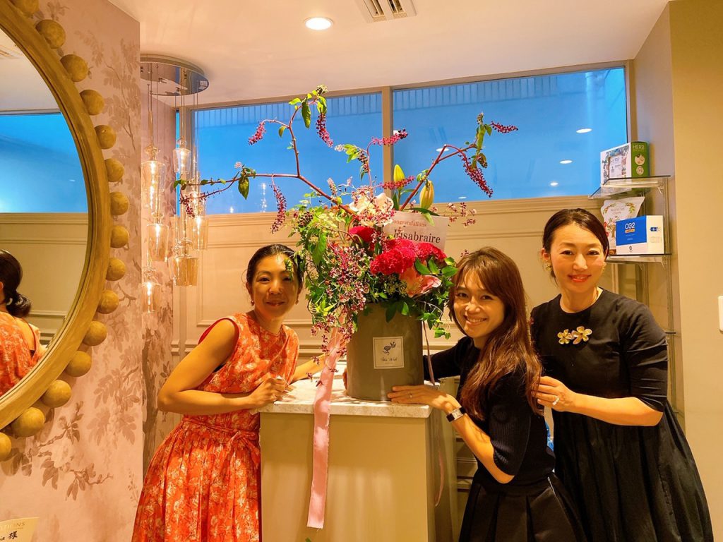 オープン前日にお邪魔した時の写真。真ん中がオーナーの未来さん、右はお花をお願いしたフラワーデザイナーの岸本さん。