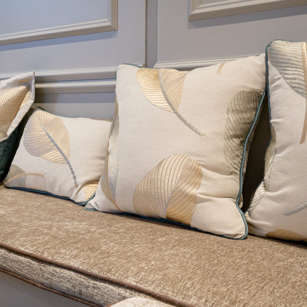 クッションをよく見ると、スツールと同じくブルーグレーのパイピングや裏生地がチラリ。仕上げやサイズを変える事で全体にリズム感がでてきます。