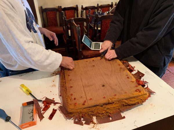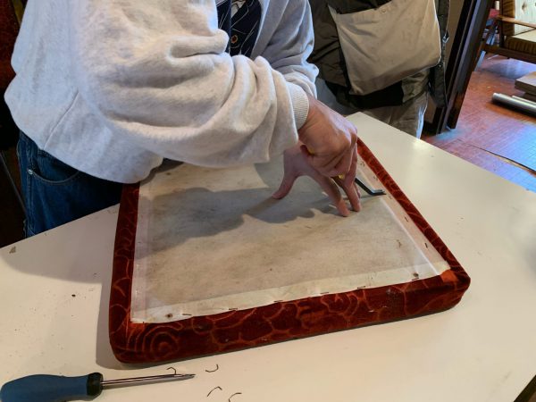 背中は2.5mmのベニヤ板に生地を張り込んでそれを正面と裏面からそれぞれ鋲で留めていたのでその鋲も取ります。