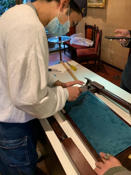 あとは、背中部分に生地を張り込んだ板を鋲で留めていきます。