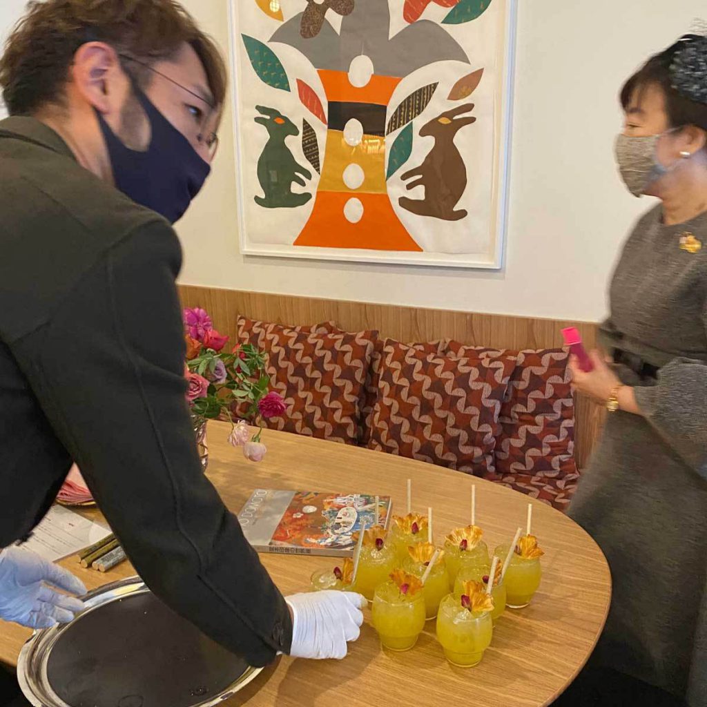 こちらがノンアルコールのウェルカムドリンク。軽食もドリンクも全てエースホテルさんが土井先生のリクエストでつくってくれたそうですが、それがまた美味しい!写真を全く撮っていなかったすが、次の写真で背景にチラッと映ってますね。