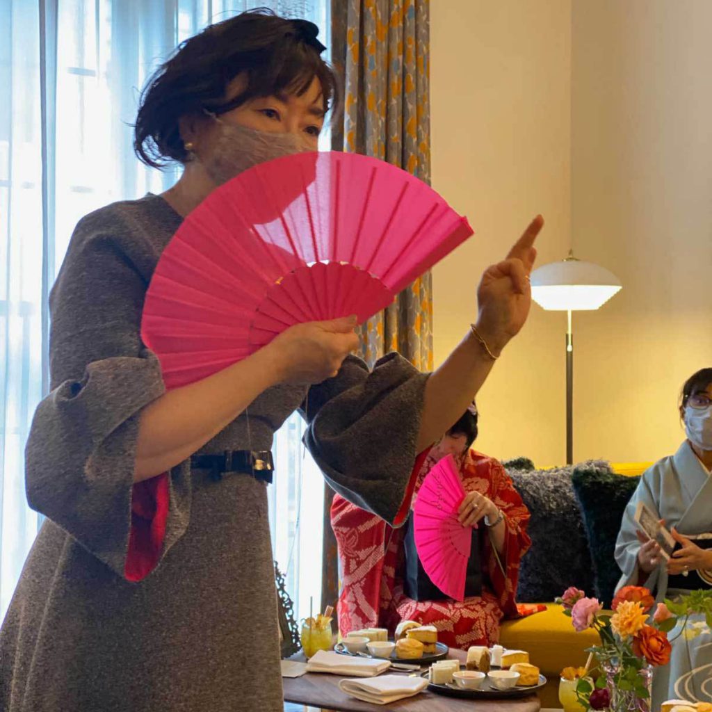 土井先生のご挨拶。参加者全員に渡された紙袋の中には遊び心溢れるアイテムが!先生が手に持っている扇子。コロナ禍と言う事でこの扇子を使い口元を隠しながらお話するマダムっぷりです。