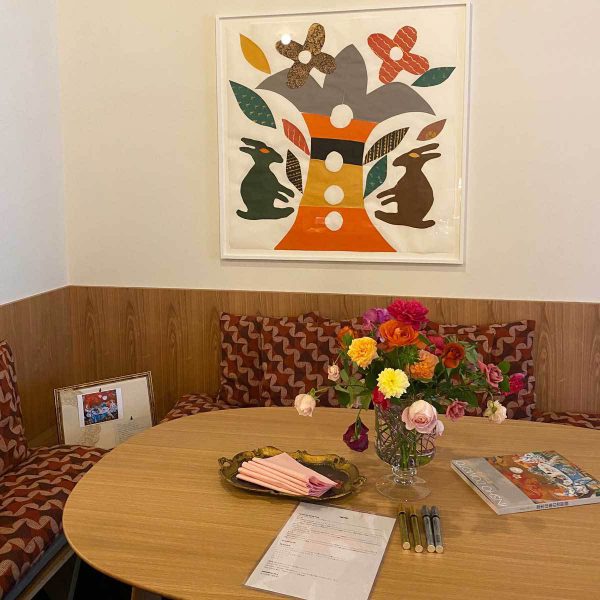 上の写真のベンチソファの上のアートは、染色家の柚木沙弥郎さんによって手掛けられた作品。私も存じ上げなかったのですが、現在98歳で現役!
