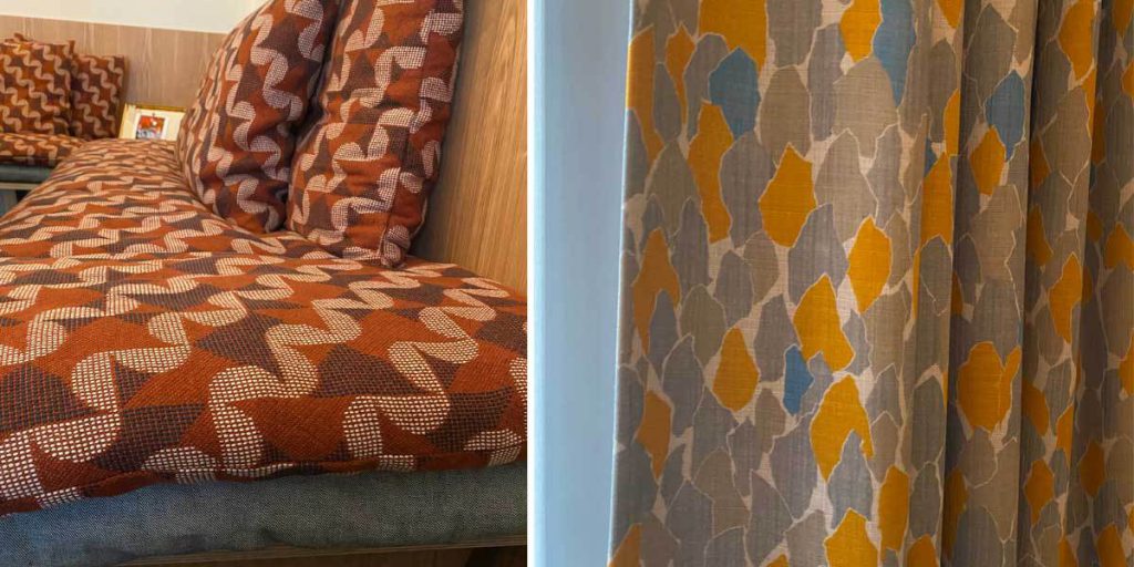 仕事柄、やはり見てしまうのが生地や仕上げ。左はベンチシートですが座布団スタイル。通常のベンチシートはしっかり厚みを持たしていきますが、座布団を2枚重ねたクッションも日本を感じつつ大変新鮮な仕上げ方です。随所に現れる拘りが見ていて楽しくCommune Designの観察力や審美眼、文化的アプローチを感じます。