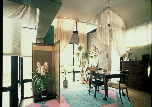 実はこの写真は自宅で35年以上前に新築でコンクリートの打ちっぱなしでした。この時はわたしもインテリアの仕事をしていたわけではなかったのですが、この時の設計の方は写真をとる時にこのカーテンを全部取って写真をとられていました。なるほど設計の方はこういう装飾的なものは好きではないだなと感じました。わたしは結構気に入っていたのですが。