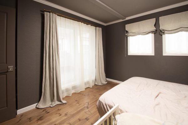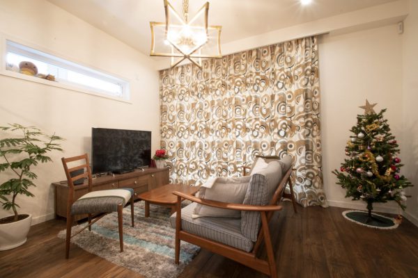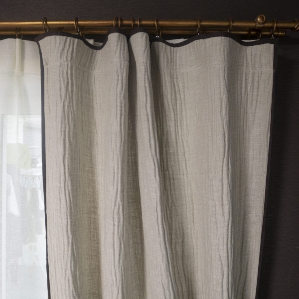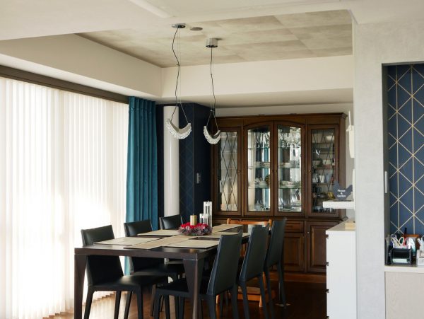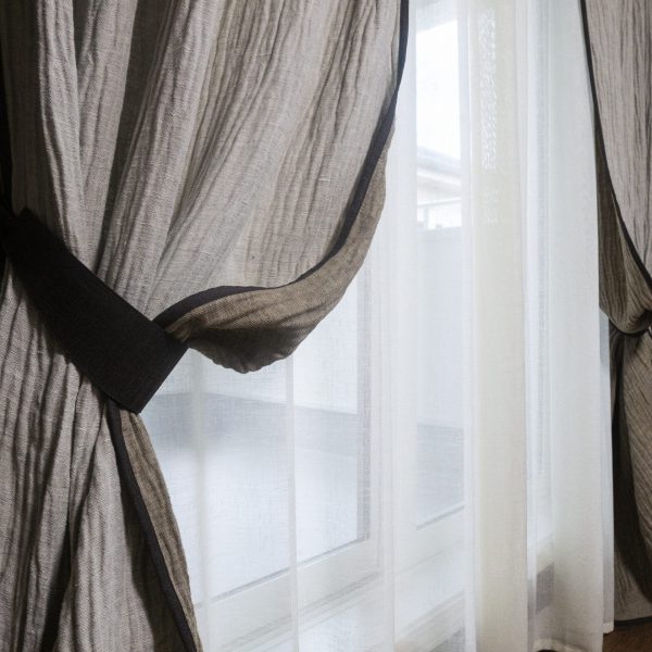 このカーテンは飾りカーテンで一つ山、バーチカルブラインドで機能性は満たし、ファブリックは雰囲気と柔らかさを楽しめるものです。カーテンにはあえてタッセルをつけずに生地の厚みを見せる方法でアクセントとします。
