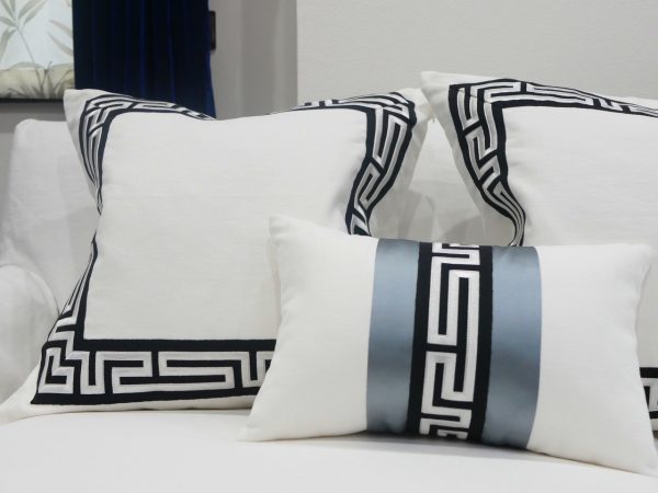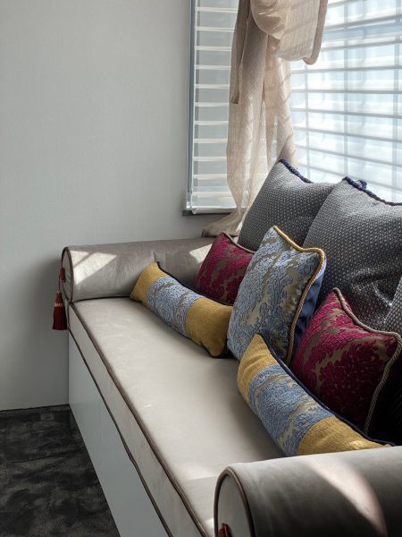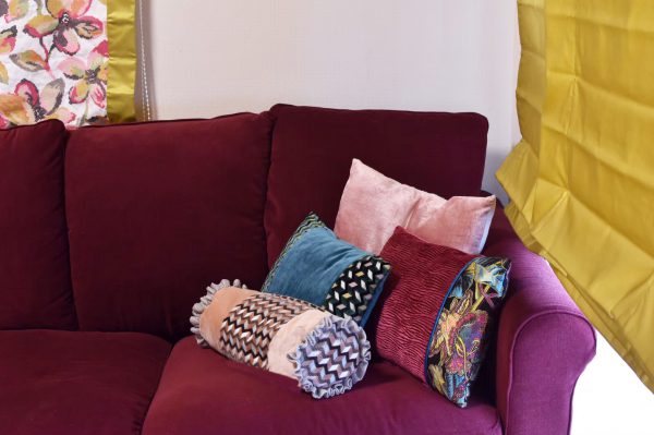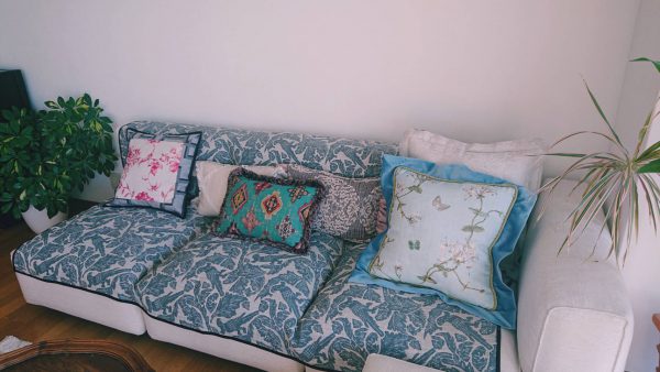 いろんな柄のクッションをミックスして楽しんでいただいてます。好きなものを1点ずつ加えていく。色々並べ替えながら何年たっても愛着を持っていただけることと思います。