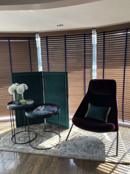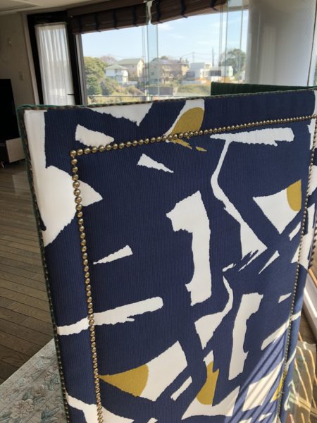コロナになって以来、対面ではないオフィシャルラインを使ったコミュニケーションで、リサブレアの商品を購入していただくお客様が増えました。このお客様もお部屋のイメージやご希望、動画まで送っていただき、そのイメージに沿っていろんな生地の画像を送り、その中からピックアップしていただいたものをサンプルでご確認いただくという流れで進んでいきました。ブログで見せられたいのが残念ですが、とても素敵なお住まいでいろいろなものをうまくコーディネートして飾られています。送らせていただいたサンプルの中で私が一番押しなのを選ばれました。特にこれが一番いいですよといったわけではないですが、ピッタリ意見があってうれしかったです。ファブリックに関しては本当に感じることですが、私たちプロでさえすべてのファブリックを見ることは不可能で、とはいいながら新しいものはできるだけチェックして、これっというもののストックは頭の中に入れるようにしています。お客様には皆様 任せていただけるのでできるだけ頑張ろうと力が湧いてきます。というわけでこのような素敵なパーティション(残念ながらお写真では柄のほうがみえてないのですが)と新しく購入されたパーソナルチェアにクッションです。パーティションは両面を楽しめるので、片面は大胆に片面はそれに合わせて無地系にとコーディネーションが楽しめます。