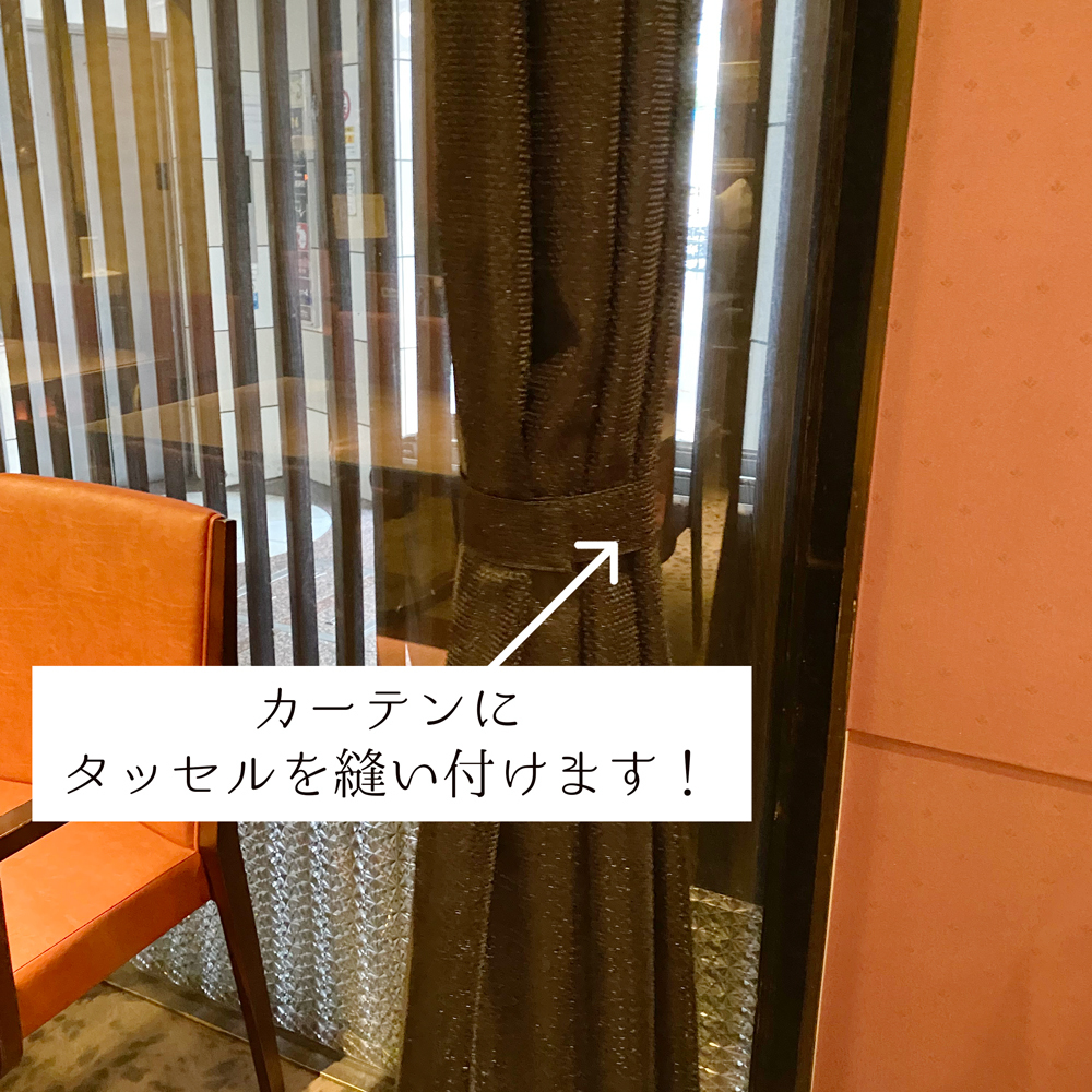そこで、カーテン自身にタッセルを縫製しました。このタッセル掛けはマジックテープで簡単に脱着できるようにしています。お店で働くスタッフの方のストレスにならないよう、とにかく簡単に短時間で開け閉めできる事が大切!