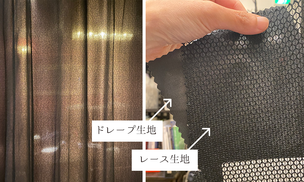 右の写真のレース生地はメッシュ素材の透けるレース、質感は抜群です。ドレープ生地は薄手の軽いタイプを選びました。