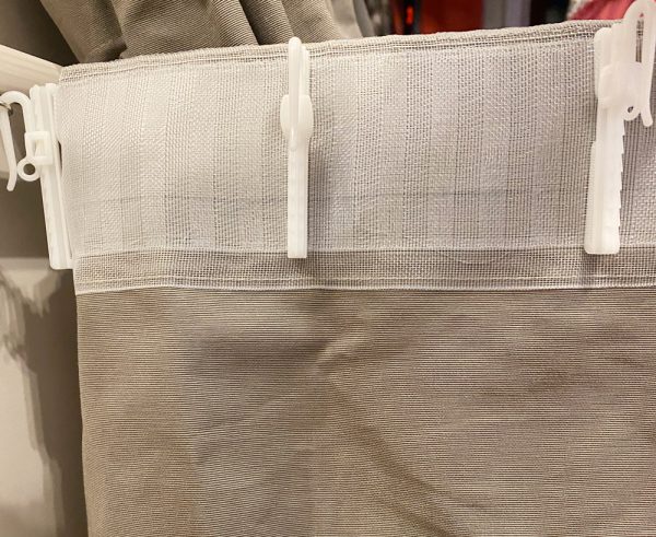 カーテンの裏側は普段見る事がないかと思いますが、カーテンの裏側にはレールに引っ掛けるフックが一定間隔で付いています。通常日本で使われるのは白プラスチックのフックです。窓に掛けていると見えないので問題ありませんが、仕切りカーテンは両サイドから見えるので裏側が見えてしまうと不恰好です。