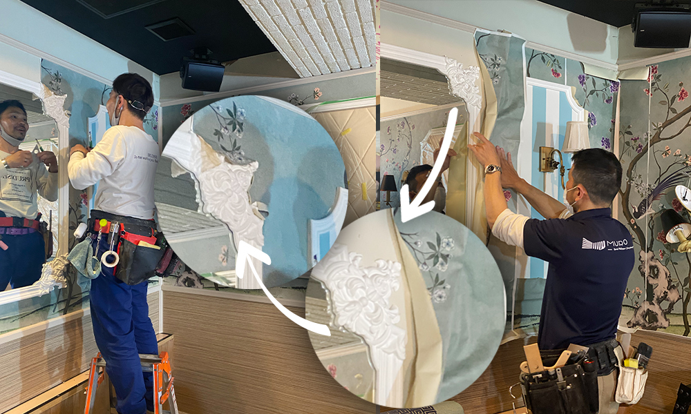 現場よりシノワズリ壁紙施工の様子をご紹介