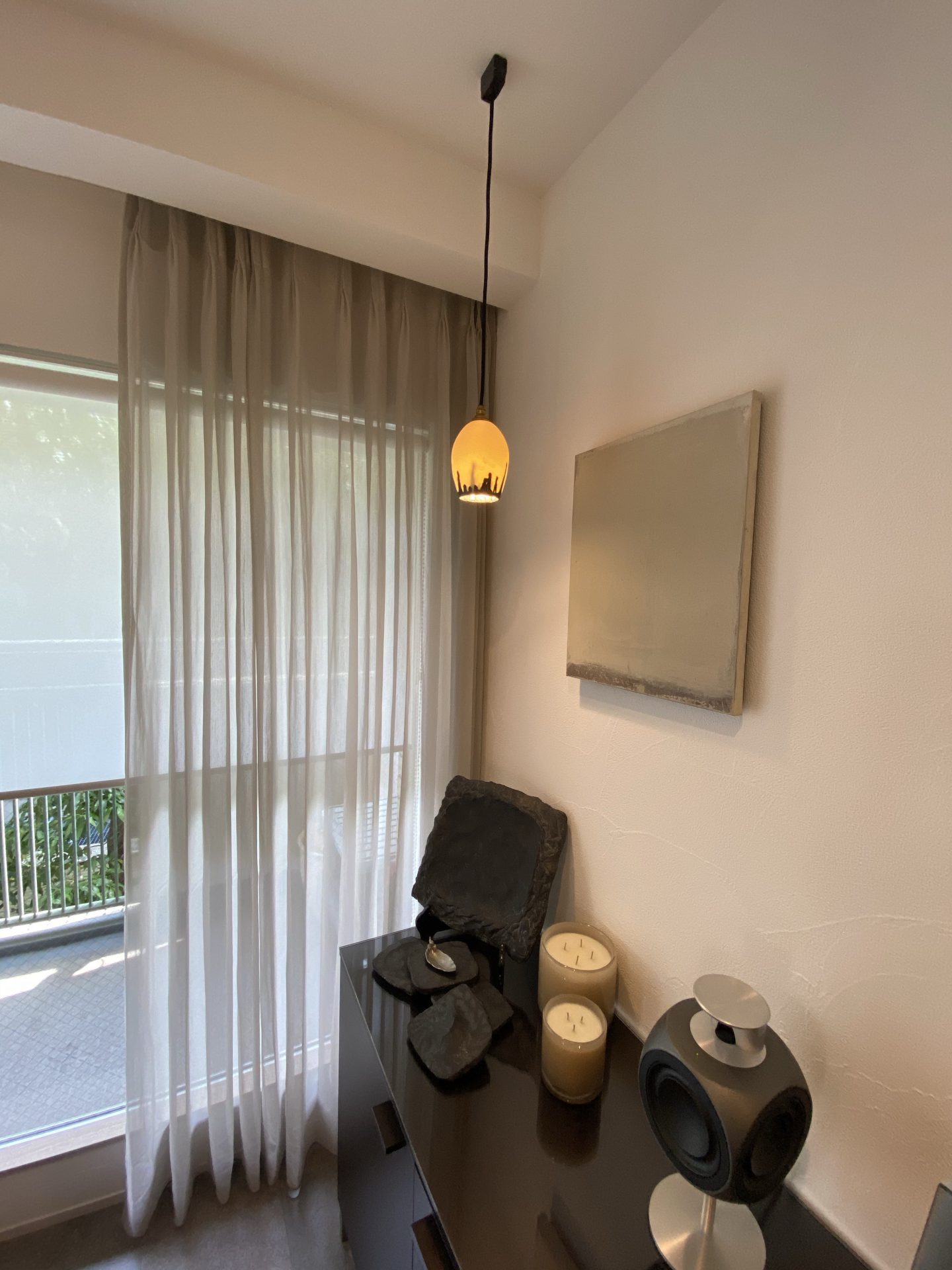 たっぷりヒダをとったレースカーテンで、昼間は優しい空間に夜は厚地のシェードをパタパタと下ろせば一枚の布がタペストリーの様になりスッキリとした空間になります。昼間と夜の雰囲気が変わるのでこちらのスタイルもおススメです。