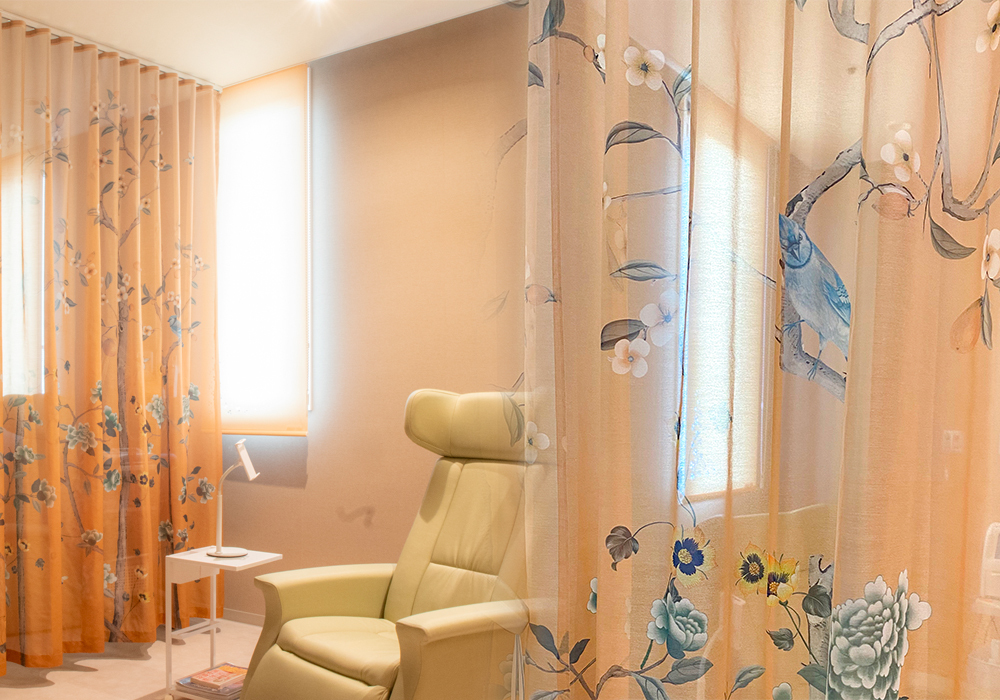下の写真は森本産婦人科クリニック様からのご依頼で制作した仕切りカーテン。隣に座る妊婦さんとの視線を遮りたいとのご希望でした。柄のデザイン、ヒダ倍率をコントロールしながら「仕切る」事に成功しました。