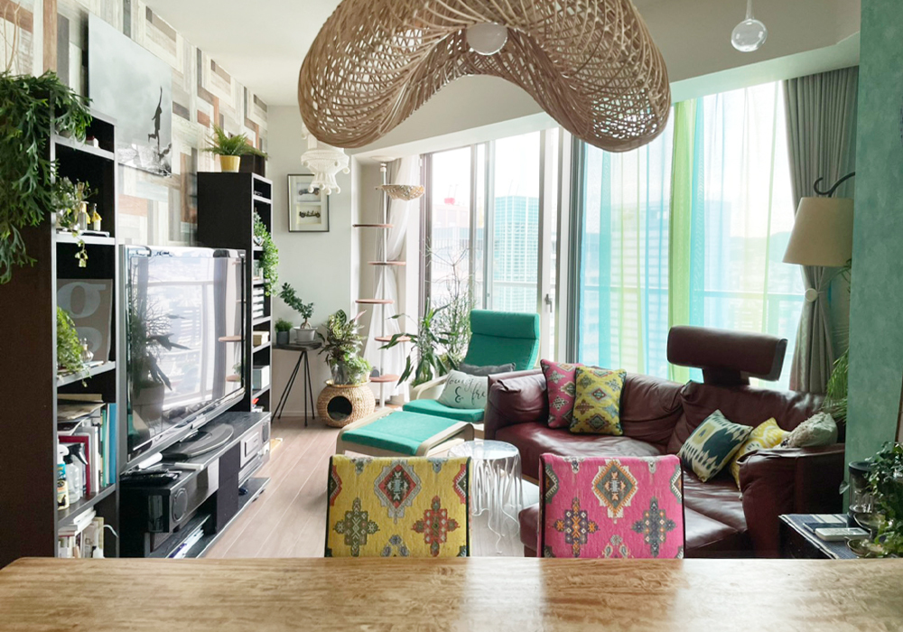 様々な色が合わさっていますがまとまっている様子はまるで海外インテリア。ダイニングで元々お使いの椅子はシンプルなもの。それはそれで素敵ですが、このニューカマー達が入ることでグっとインテリアが華やかになり、グレードアップされた感があります。