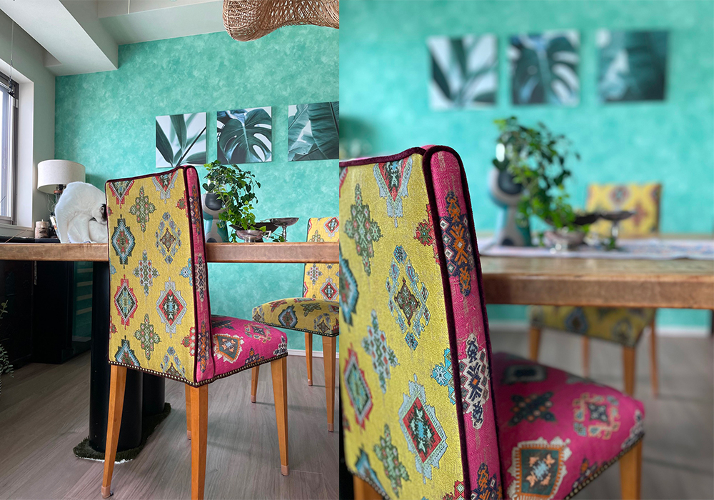 下の写真が生まれ変わった椅子が入ったダイニングのアフターです!ビビットなピンクとイエローが加わることで、背景のグリーンの壁紙がより一層引き立ち、まるで海外のインテリアの様な見事な色の組み合わせ。もちろん上質な生地を使っているので派手な色にも関わらず上品な存在感が魅力です。