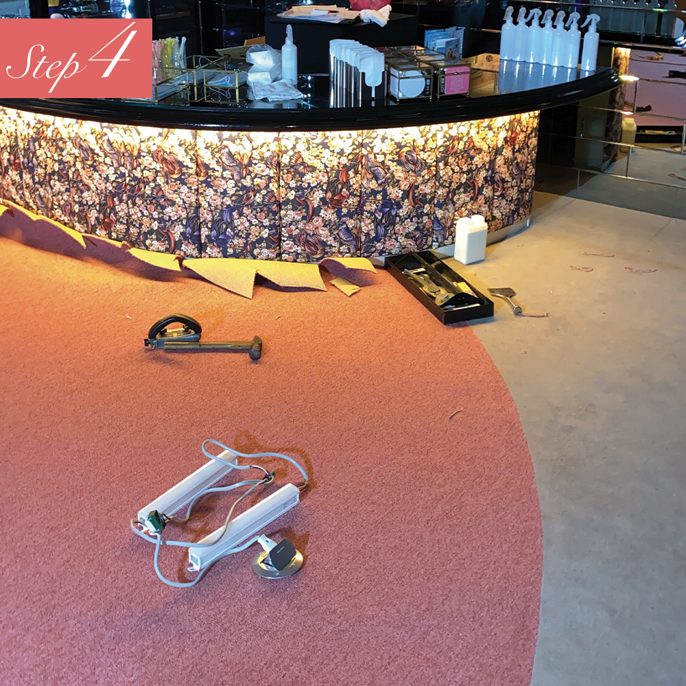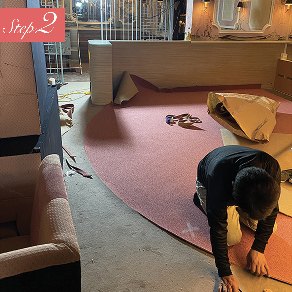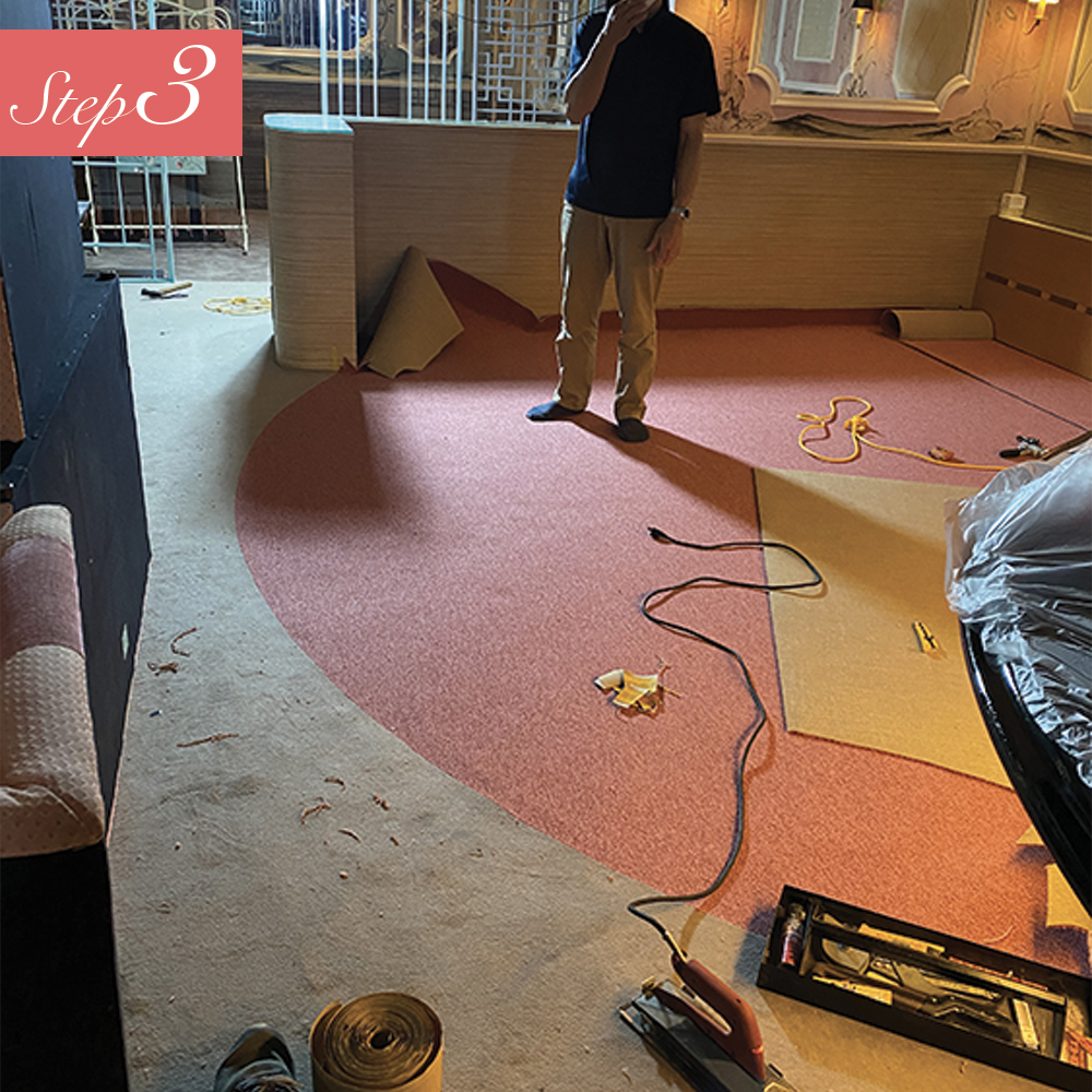 新しい濃いピンク色のカーペットも同じようにカットし、カット面を合わせていきます。簡単そうに見えますがカーペットは伸縮し、ピンっと張る事が難しくバランスをと取りながら貼る作業は正に職人技です。これは職人さんから聞いたのですが、カーペットを貼れる職人さんは数が減ってきているそうです。私も初めて施工を見たのですが、片膝を床に付いて引っ張りながら納めている姿に感動でした!