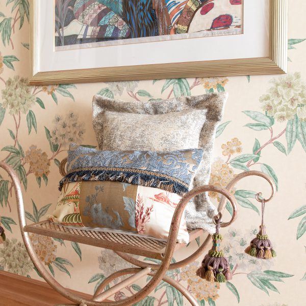 この生地は、生地単体で見た時と椅子貼りやクッション等で使用した時の見え方が違うのですが、それがまた魅力的。モダンでもクラシックでも使えてしまう不思議な生地です。