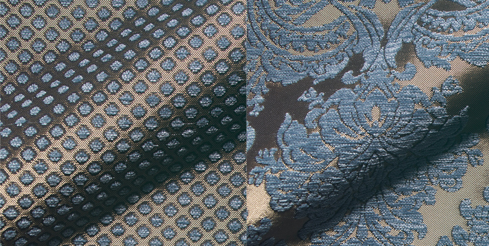 右側:Blue Damask Metallic(HOPKE):¥10,800(税込)/M・140cm幅 リピート 横方向76cm 縦方向36cm