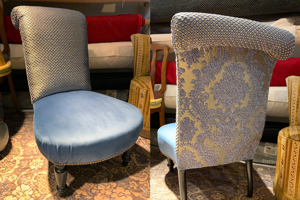 こちらも先ほどと同様に、ダマスクxドットの組み合わせで椅子貼りをしたアンティークチェア。電球色の照明の下なのでゴールド感が際立ちます。貼り生地の組み合わせ次第でインテリア性がぐっと上がります。