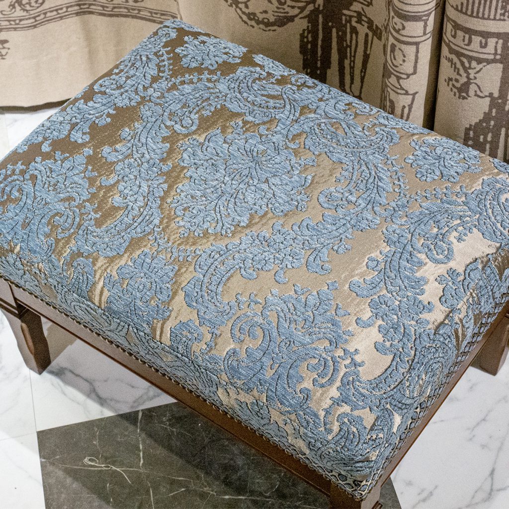 上から見るとこの様な感じ。このオットマンの幅は70cm程度、ダマスク柄のリピートが76cmと大きいので、貼った時にダマスクがダイナミックに見えるのです。
