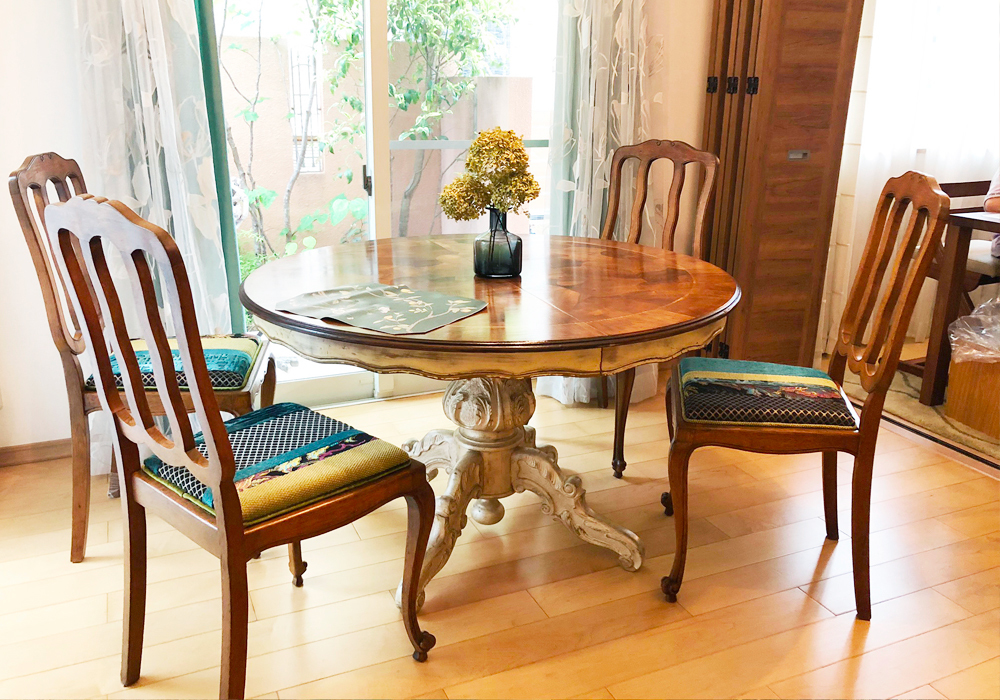 こちらがダイニングスペース全体の写真。以前はガラス天板+合皮チェアというスタンダードな組み合わせでした。アンティークチェア+木製丸テーブルでガラリと印象が変わり温かみのあるインテリアにアップデートしました。鮮やかな色味の生地に黒が入ることで落ち付いた雰囲気になりますね。