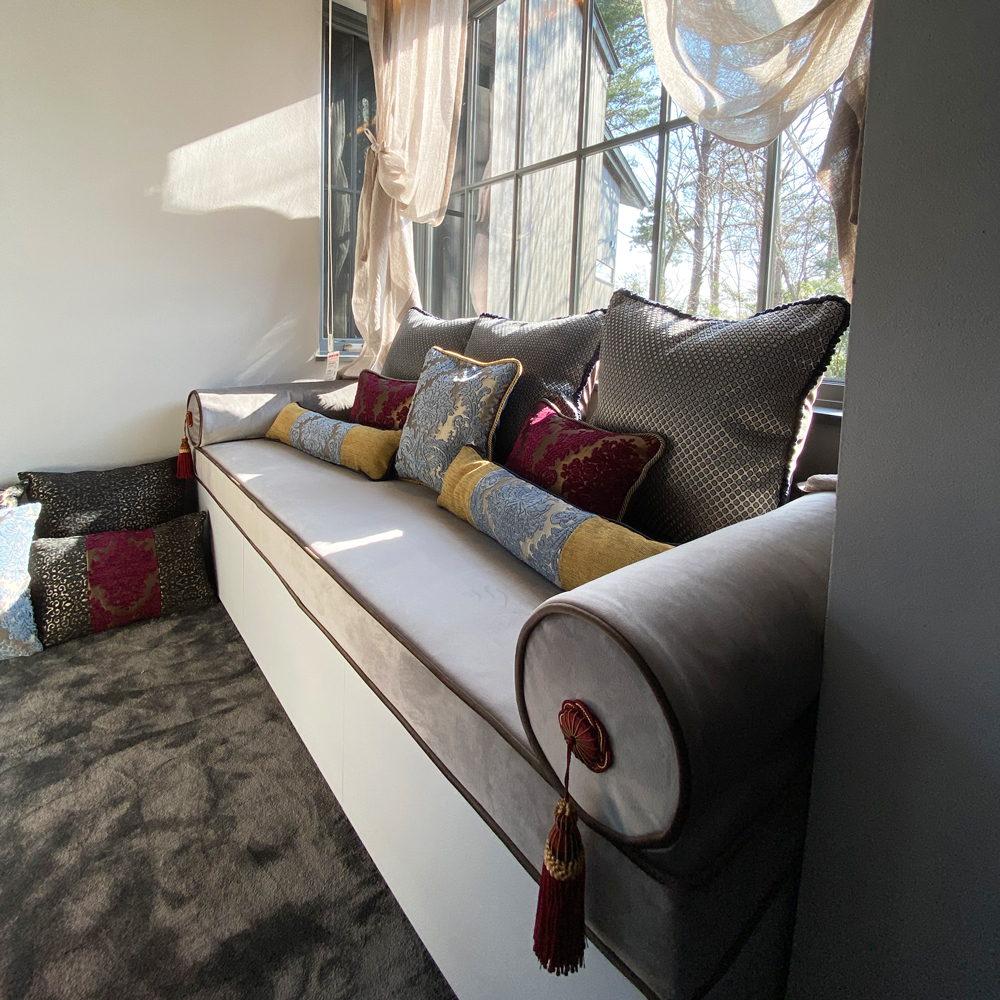 M様、この生地コレクションに惚れ込んで頂き、奥様のお部屋に沢山のオーダークッションを制作させて頂きました。ベンチシートに乗り切らなかったクッションは床に置かせて頂いてます(笑)3色バリエですが、しっかりまとまっている玄人感溢れる組み合わせ!