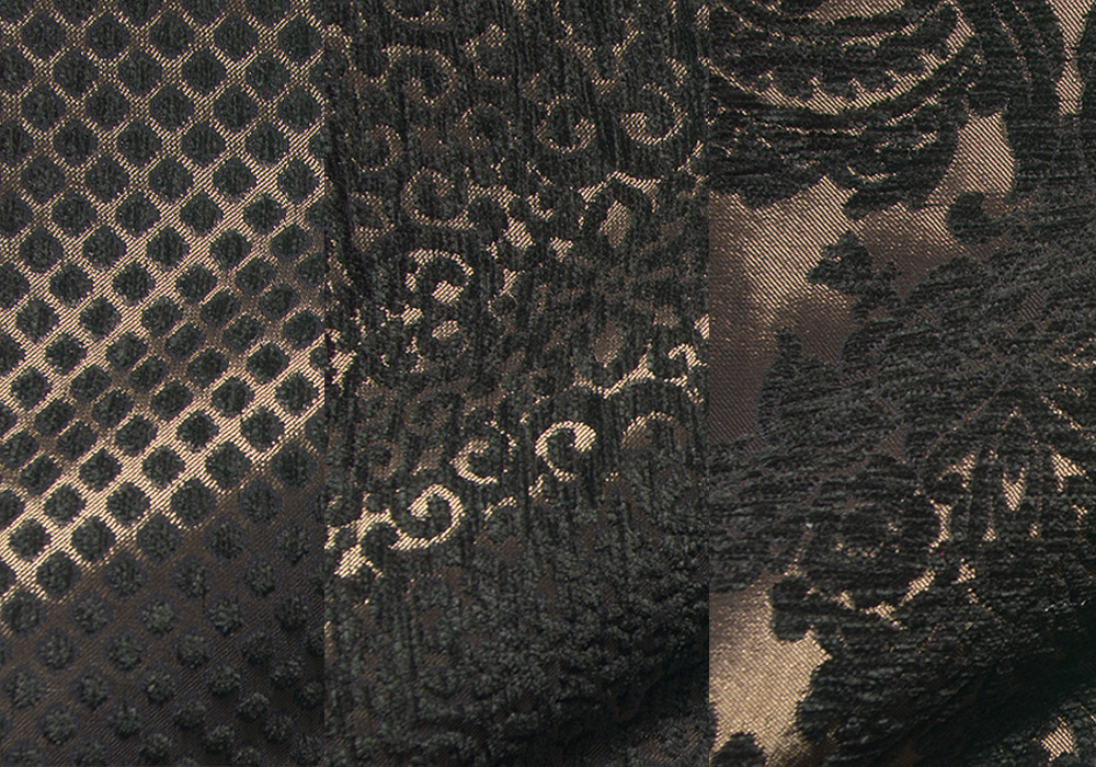 生地の単体の写真も見ていきましょう!在庫しているのはドットのみですが、施工例を見ていると中央、右側の生地も使っておりますのでご紹介致します。ゴールドメタリックのベースに黒の柄が浮き立つ立体的な生地。
