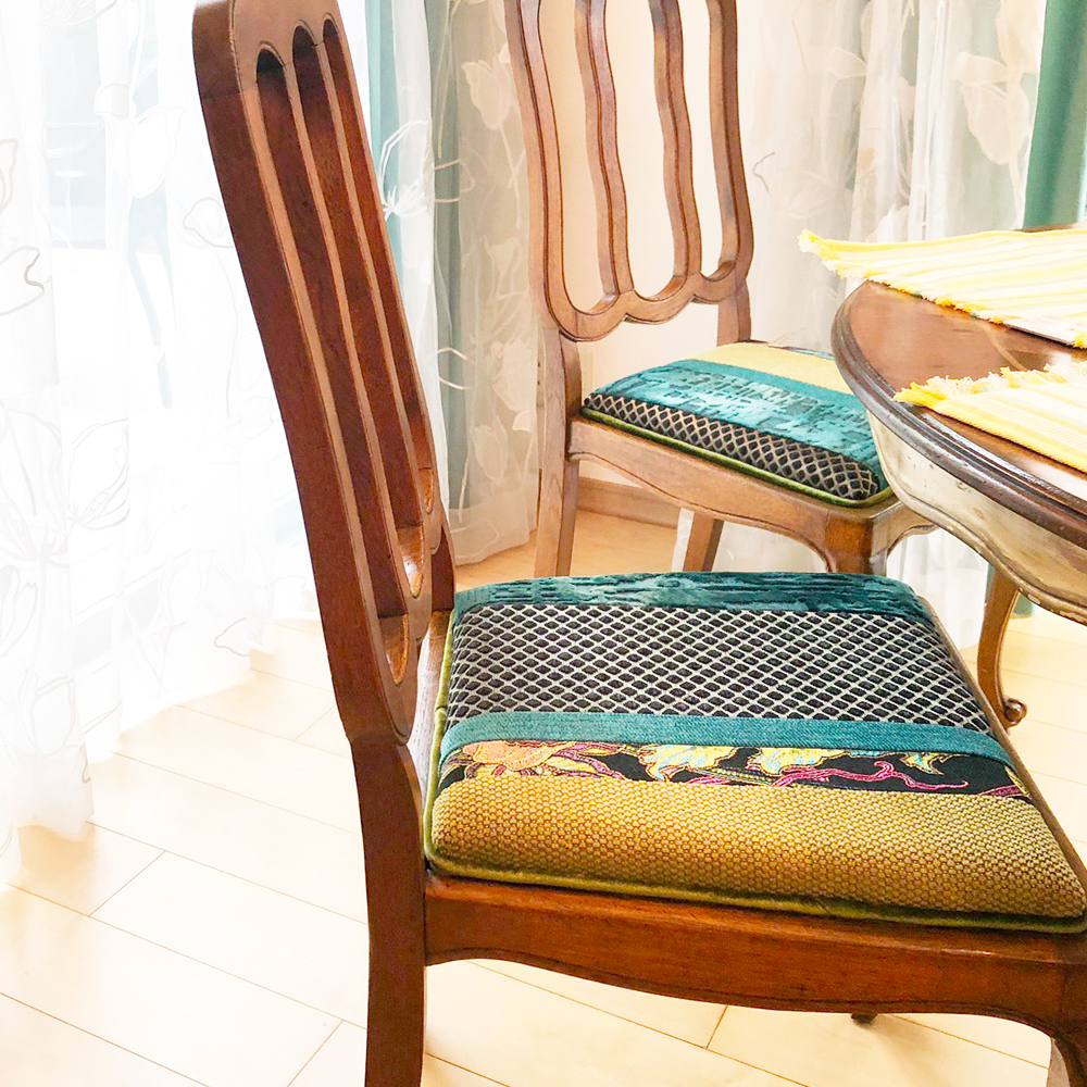 続きまして、アンティークチェアの座面にパッチワークで貼った時の施工例!4台をダイニング用にご購入頂いたN様邸。全て同じ生地を使っていますがバランスを変えたりパイピングを変えて楽しむバラバラ感が堪りません(笑)