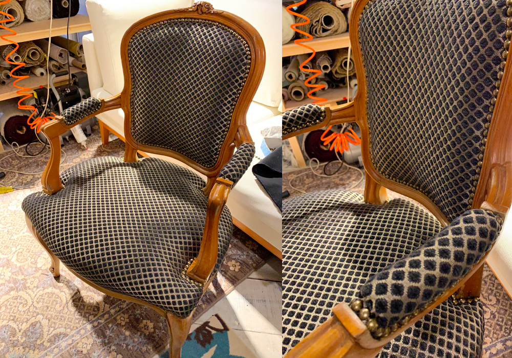 こちらはまた別のお客様の施工例。クラシックなアームチェアの貼り替えをご依頼頂きました。