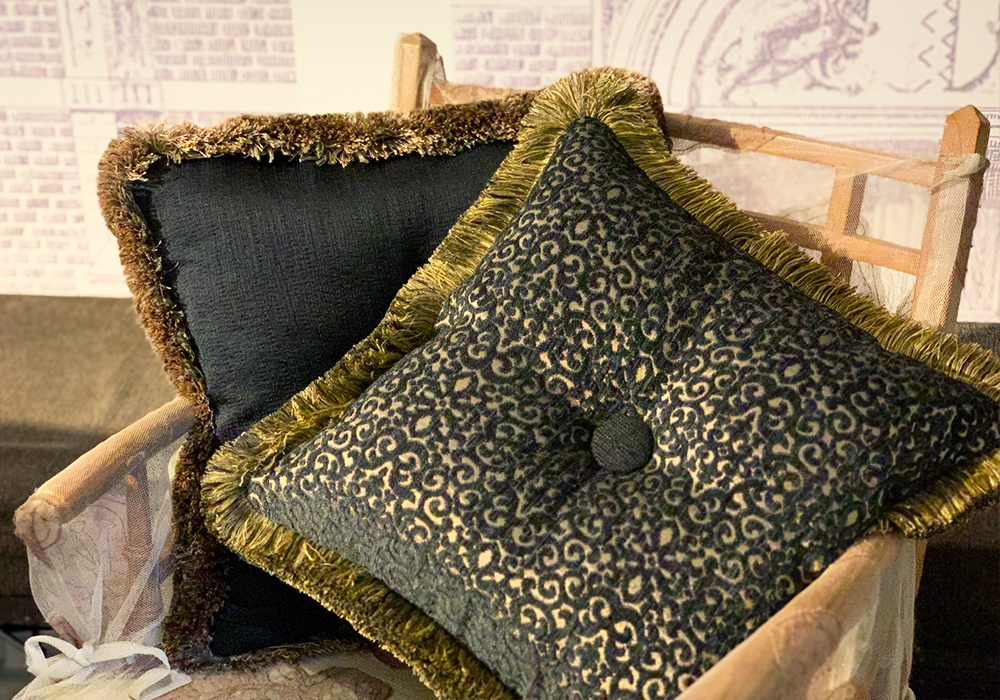 包みボタンを付けることでクッションに凸凹が生まれ、生地の立体感をお楽しみ頂けます。同じゴールド系のブレードを付けております。ブレードも色んな種類があるので、自分なりの合わせ方でお楽しみ頂けます。