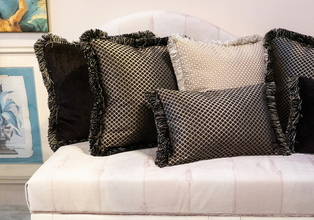 こちらはお見事なゴールドx黒のクッションたち。お家のリビングルームのソファに置かれるとのことで6つセットでオーダー頂きました。サイズを変えることでリズムが生まれます。ゴールドx白は弊社の撮影用で忍び込ませました(笑)