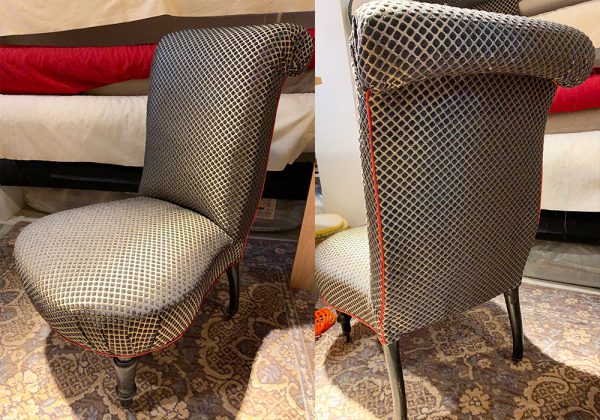 そして、こちらは弊社で貼り替えたアンティークチェア。全てゴールドx黒のドット生地を使い、アクセントとして赤のパイピングを入れております。下の写真は弊社のワークルームで撮影した記録写真。