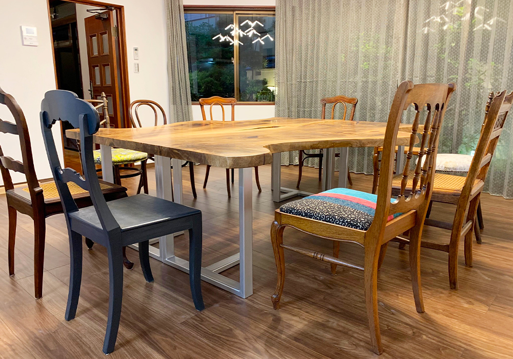 続いては、弊社のアンティークチェアを10脚をゲストハウスのダイニングスペースに導入して頂いた事例です。椅子も貼り生地もバラバラですが何故かまとまる楽しいインテリアですね。どの椅子に座ろうか?!とワクワクしてしまいます。