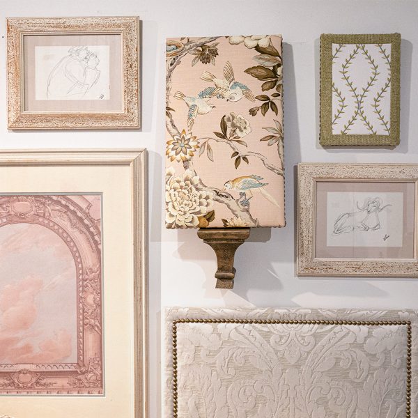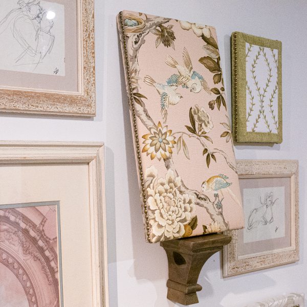 先ずは、ピンクのシノワズリ生地を使ったファブリックパネル。サイズは27×45.5cmとウォールデコとしてはトライしやすいサイズ。お玄関やトイレ、リビングに掛けるなら写真のようにフレーム等とミックスしてコーディネートして頂きたいアイテムです。