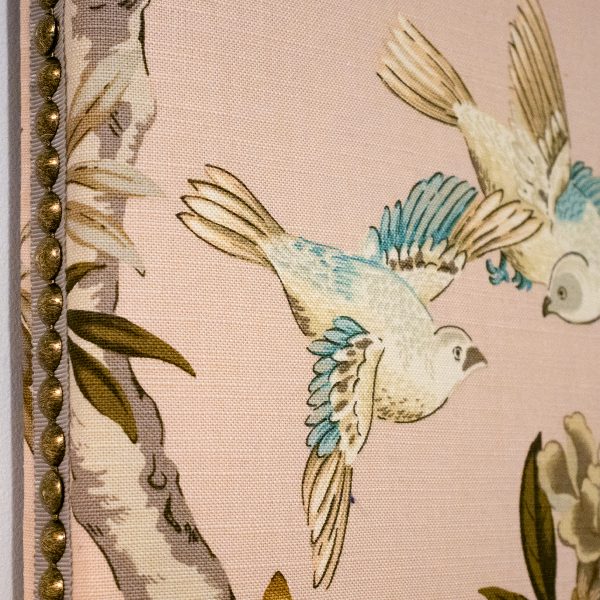 こちらがサイドの仕上げ!ピンクは柔らかく仕上げてますが、ダークグレーのグログランにシルバーの鋲でコントラストをしっかり付けて仕上げております。3羽の鳥さんが気ままに過ごしている様子は見ていて落ち着きますねー。