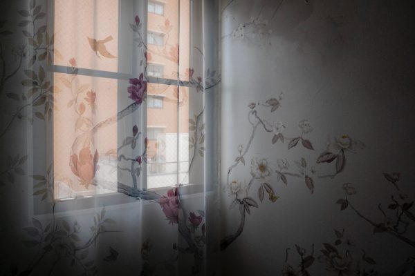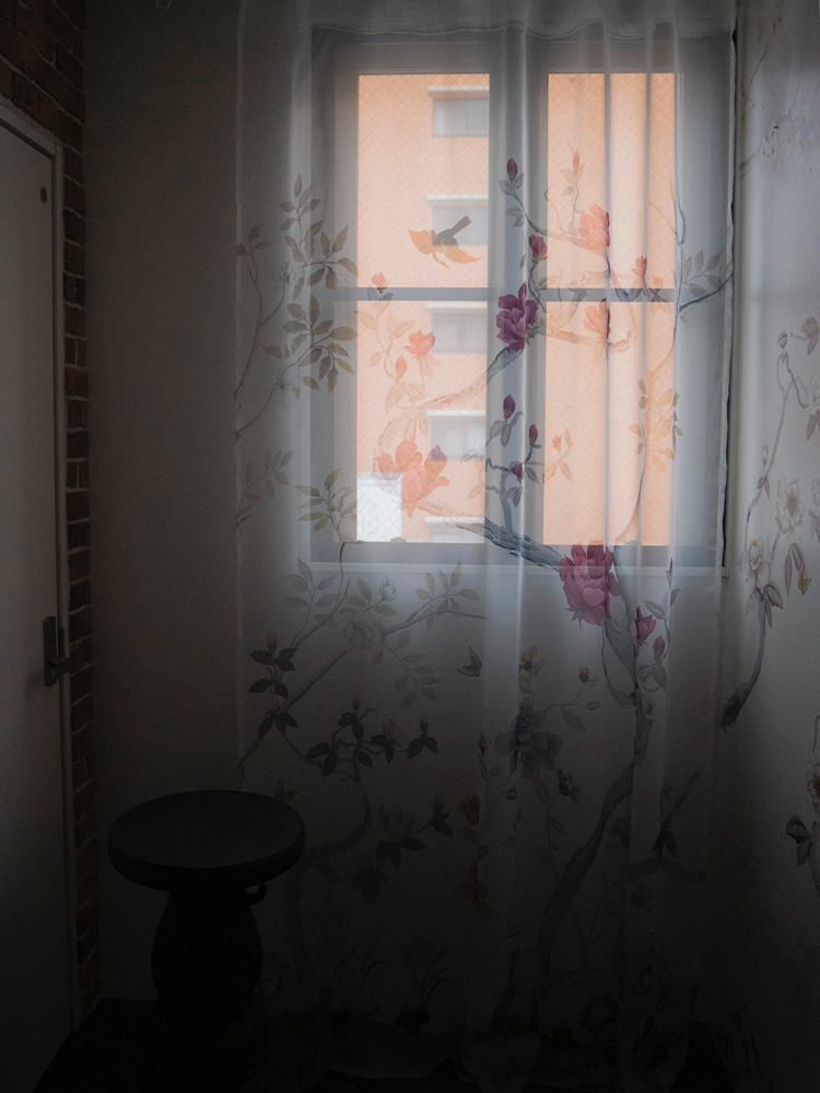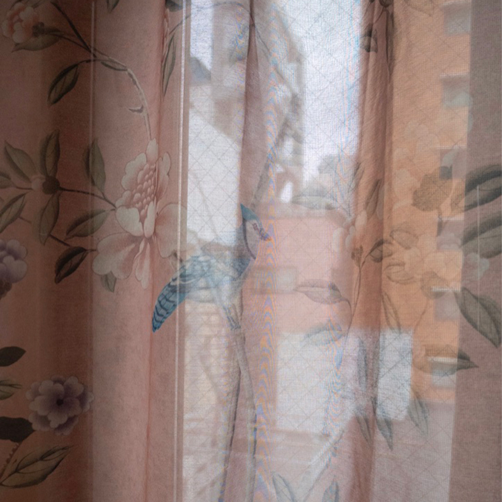 続きまして、色違いピンクのレースカーテン。光が入ると全く印象が変わりますね。レースの魅力は透け感による表情の違いにあります。日中太陽光が差し込んだ時は外の景色と一体化し、夜は部屋の明かりで浮かび上がります。
