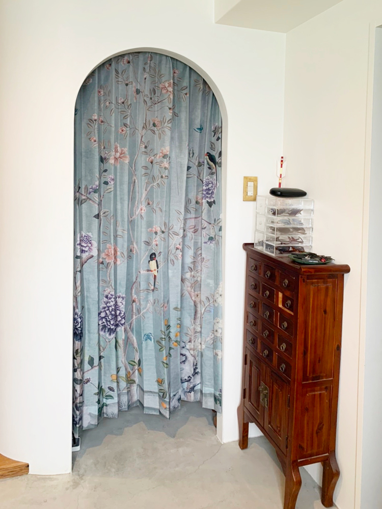 このアーチの扉の向こうは収納スペースとなっております。ビフォア写真は非公開ですがお家にある布を無理矢理引っ掛けて隠してました。弊社スタッフが採寸に伺い最後のレール+カーテンの取り付けはお客様ご自身でされました。拍手です!
