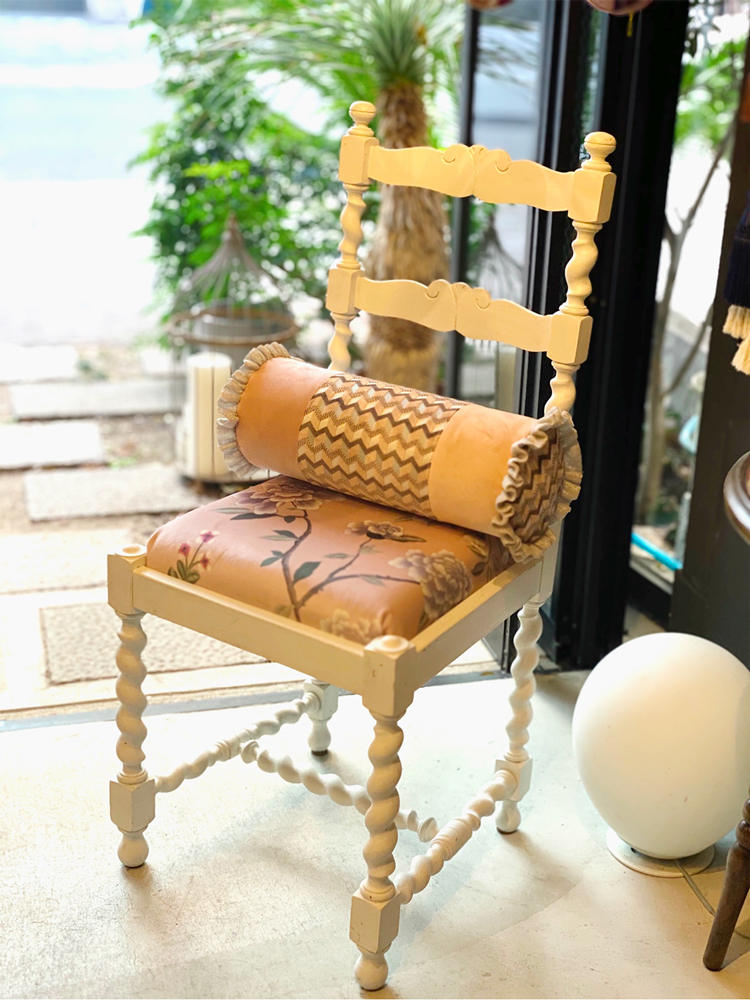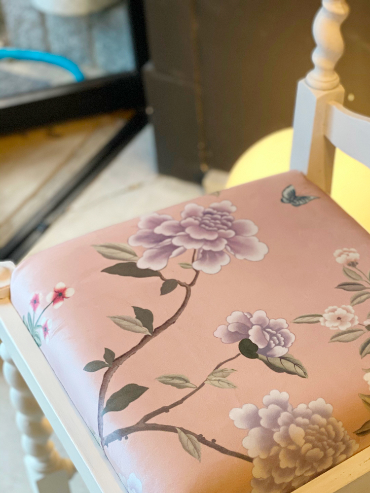 弊社のお気に入りのカントリー風のアンティークチェアの貼り生地を、シノワズリに貼り替えました!