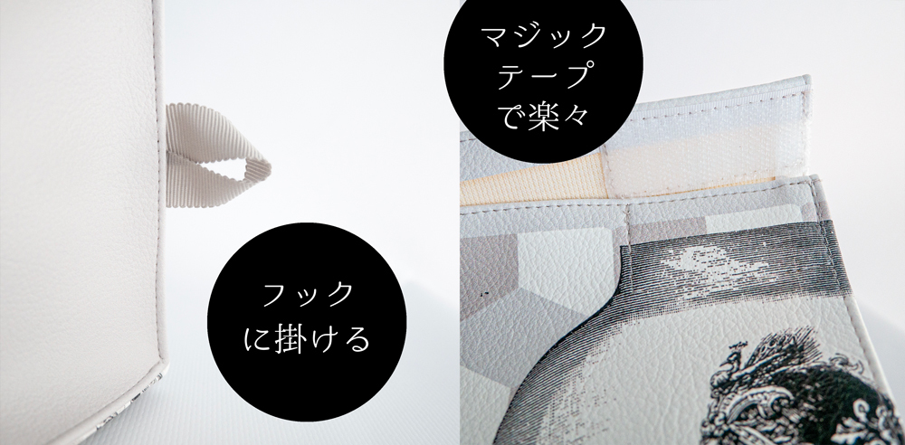 簡単にティッシュケースの出し入れをして頂けるよう、マジックテープで簡単に開閉できるようにしています。