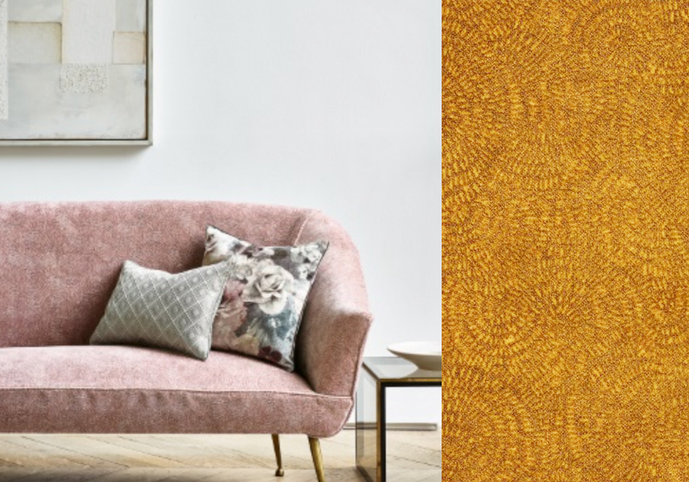 メーカーの生地紹介写真。左側はピンクの生地をソファに貼ったもの。右側の生地が実際に使った生地。