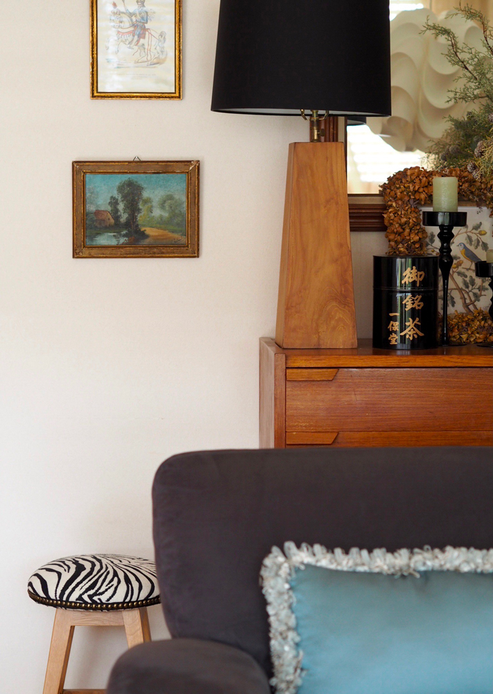 デザ子さんのお家は、北欧とオリエンタルな要素が融合する大変落ち着きのあるインテリア。下の写真にもありますが元々は茶色の革張りでした。そして今回選ばれたのは「ゼブラ柄」。小物で黒を入れ、その黒を繋いでいくような役割のゼブラ柄のスツール!