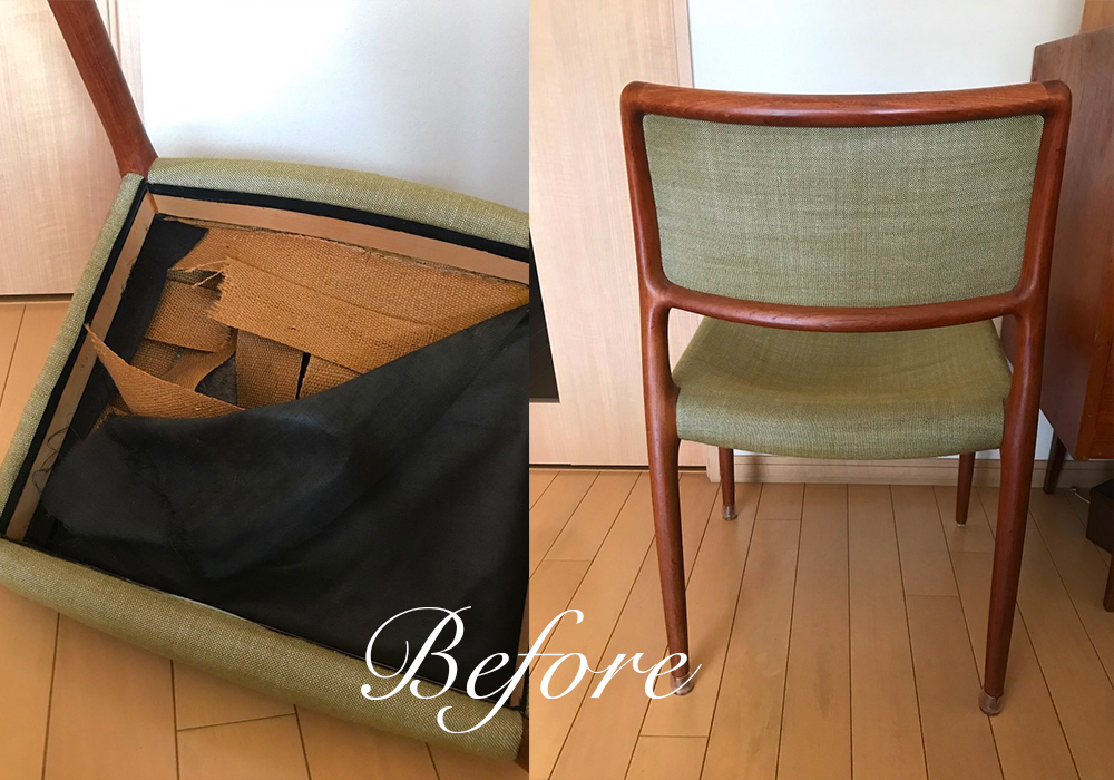 座面を支えているテープが破れて、座面が極端に沈んでしまっていました。テープを貼り直し、中材をたっぷり入れて仕上げました。