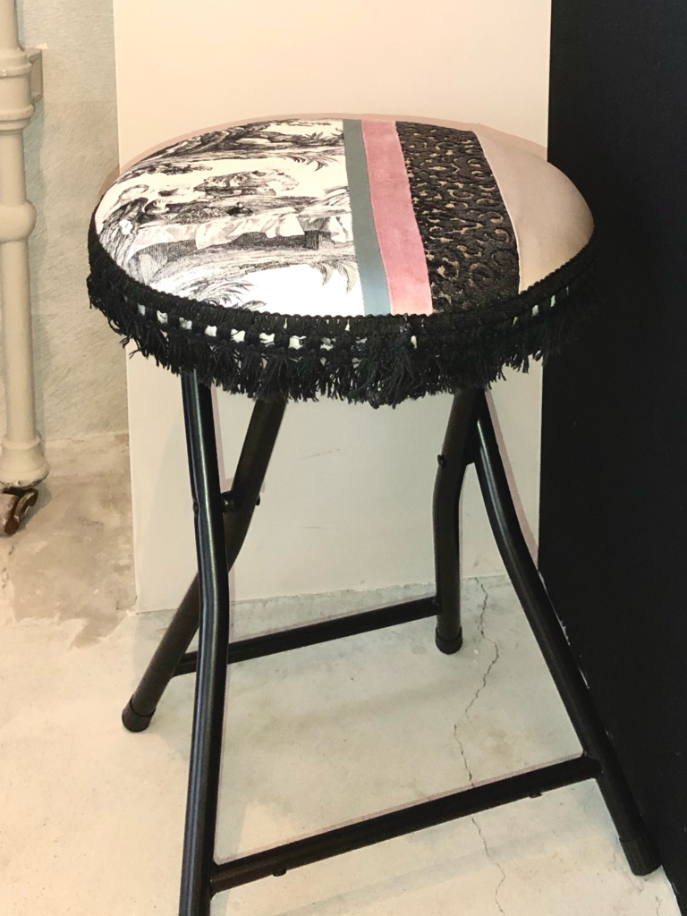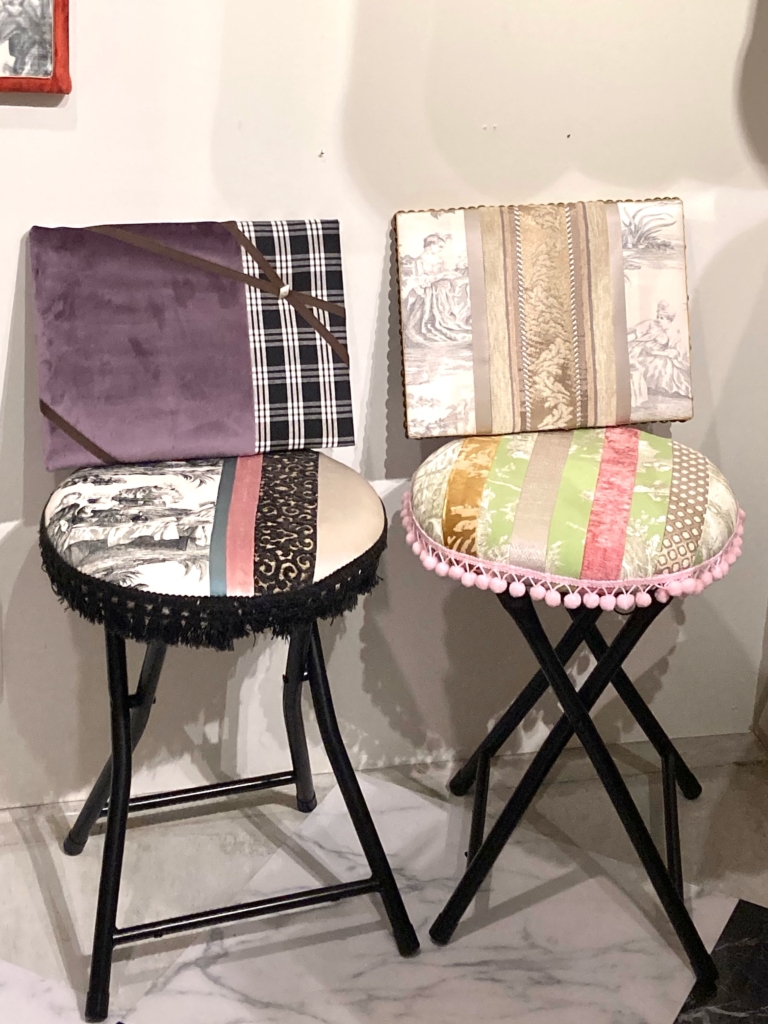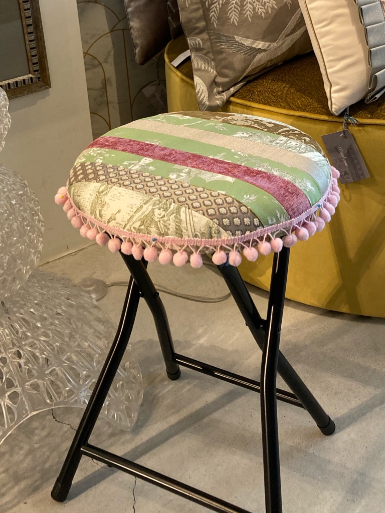渡部 「緑色の生地をベースにしたパッチワークの布を貼った折りたたみ椅子。マスタードイエローや深みのあるピンクの布を使用し、ナチュラルな物に仕上がっています。パステルピンクのフリンジが全体を明るくしてくれています。」