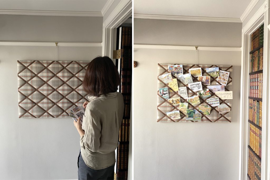 弊社では、度々お客様からのオーダーで制作させて頂いております。山田さんがキラキラした目で「現地で収集してきたポストカードを並べたい!その為にグログランテープ付きのファブリックパネルが欲しい!」とご相談を頂きました。