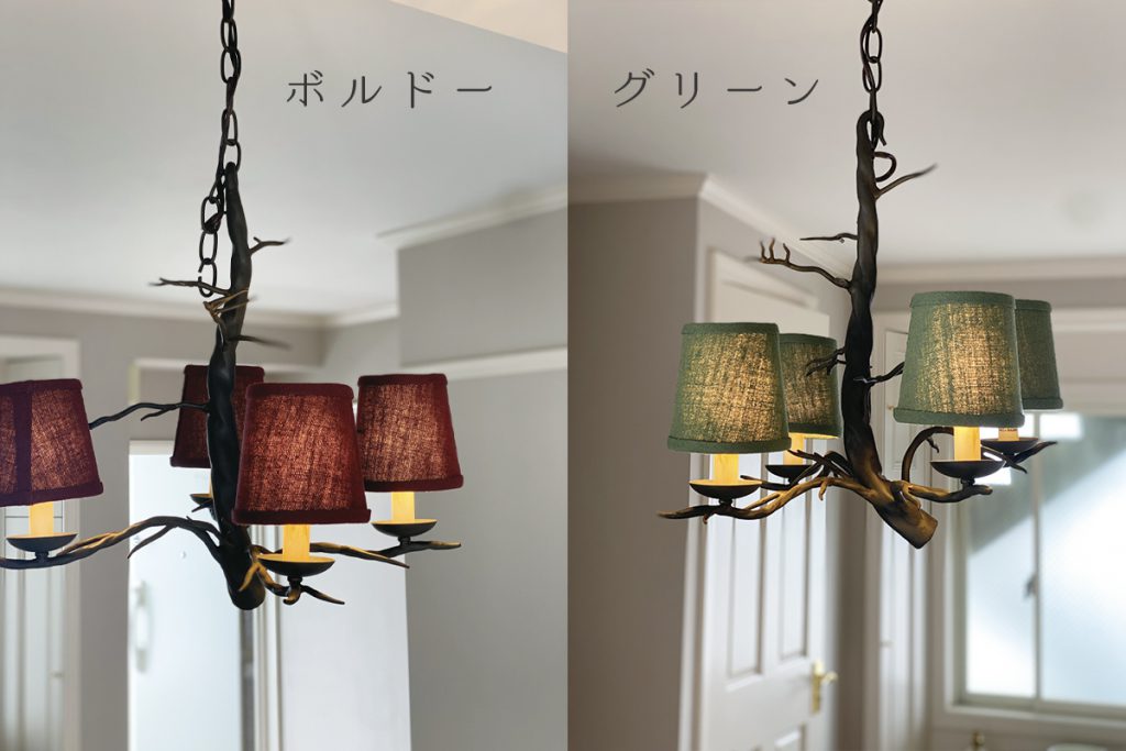 このペンダントライトにはシェードが付いているのですが、そのシェードにも生地を貼って2色セットでご準備させて頂きました。その時々の内装やイベント時で使い分けるそうです。